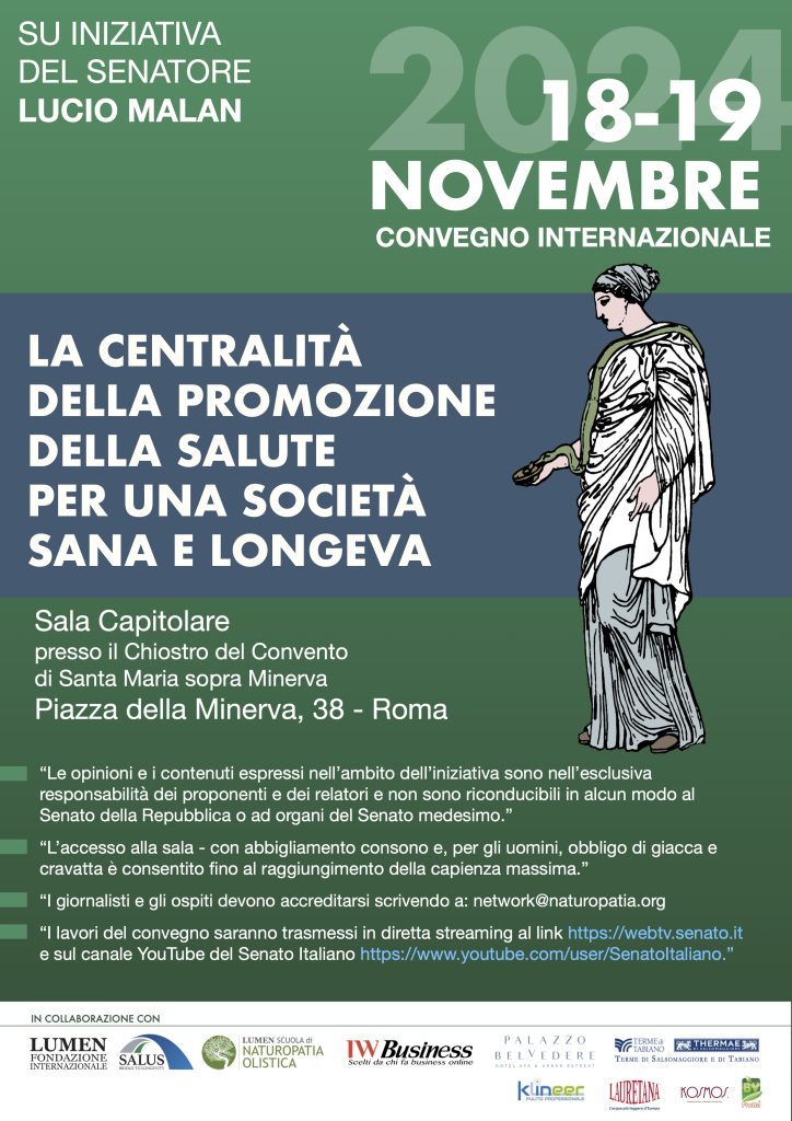 La Scuola di Naturopatia LUMEN collabora all’organizzazione del convegno internazionale “La centralità della promozione della salute per una società sana e longeva”; promosso da Fondazione Internazionale LUMEN e Rete Europea SALUS, il convegno si svolgerà il 18-19 novembre 2024 presso la Sala Capitolare del Senato a Roma. L’evento è ospitato dal sen. Lucio Malan e vedrà la partecipazione di esponenti politici, italiani ed europei, finalizzata a stimolare un confronto trasversale su temi importanti come la promozione della salute e della longevità sana; tale occasione rappresenterà inoltre la possibilità di valorizzare la Medicina Tradizionale Europea e Mediterranea (MTEM) e il suo patrimonio culturale di pratiche efficaci per il raggiungimento di questi obiettivi.
