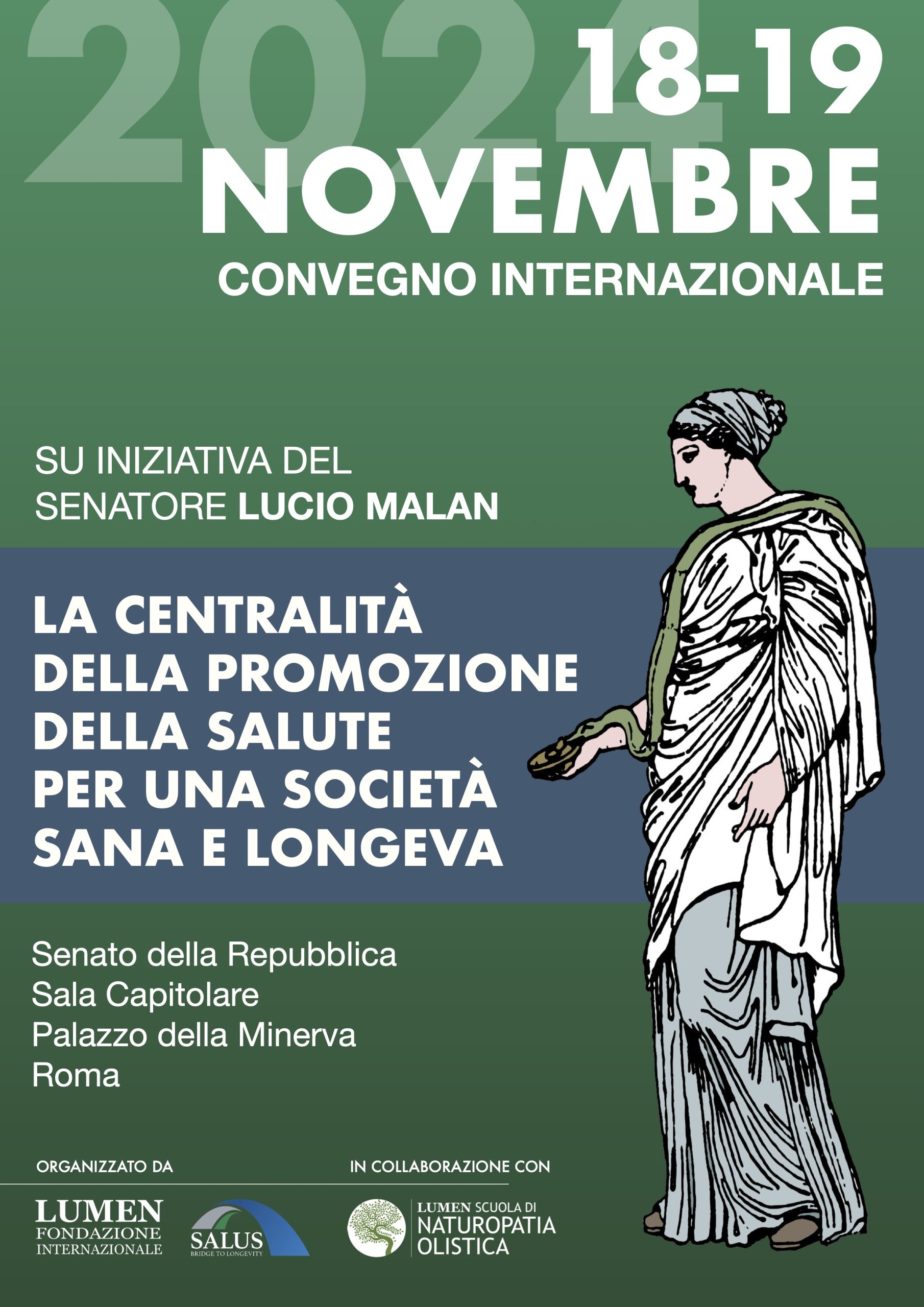 La Scuola di Naturopatia LUMEN collabora all’organizzazione del convegno internazionale “La centralità della promozione della salute per una società sana e longeva”; promosso da Fondazione Internazionale LUMEN e Rete Europea SALUS, il convegno si svolgerà il 18-19 novembre 2024 presso la Sala Capitolare del Senato a Roma. L’evento è ospitato dal sen. Lucio Malan e vedrà la partecipazione di esponenti politici, italiani ed europei, finalizzata a stimolare un confronto trasversale su temi importanti come la promozione della salute e della longevità sana; tale occasione rappresenterà inoltre la possibilità di valorizzare la Medicina Tradizionale Europea e Mediterranea (MTEM) e il suo patrimonio culturale di pratiche efficaci per il raggiungimento di questi obiettivi.